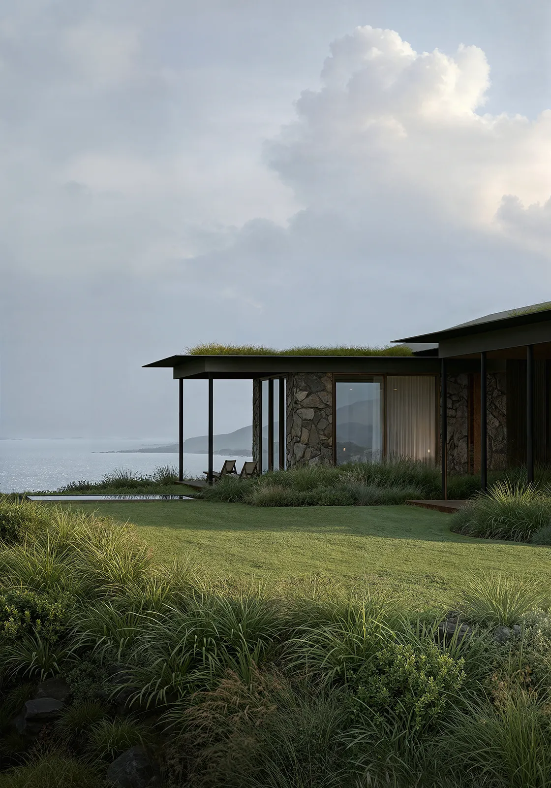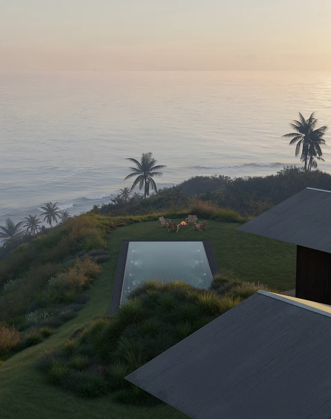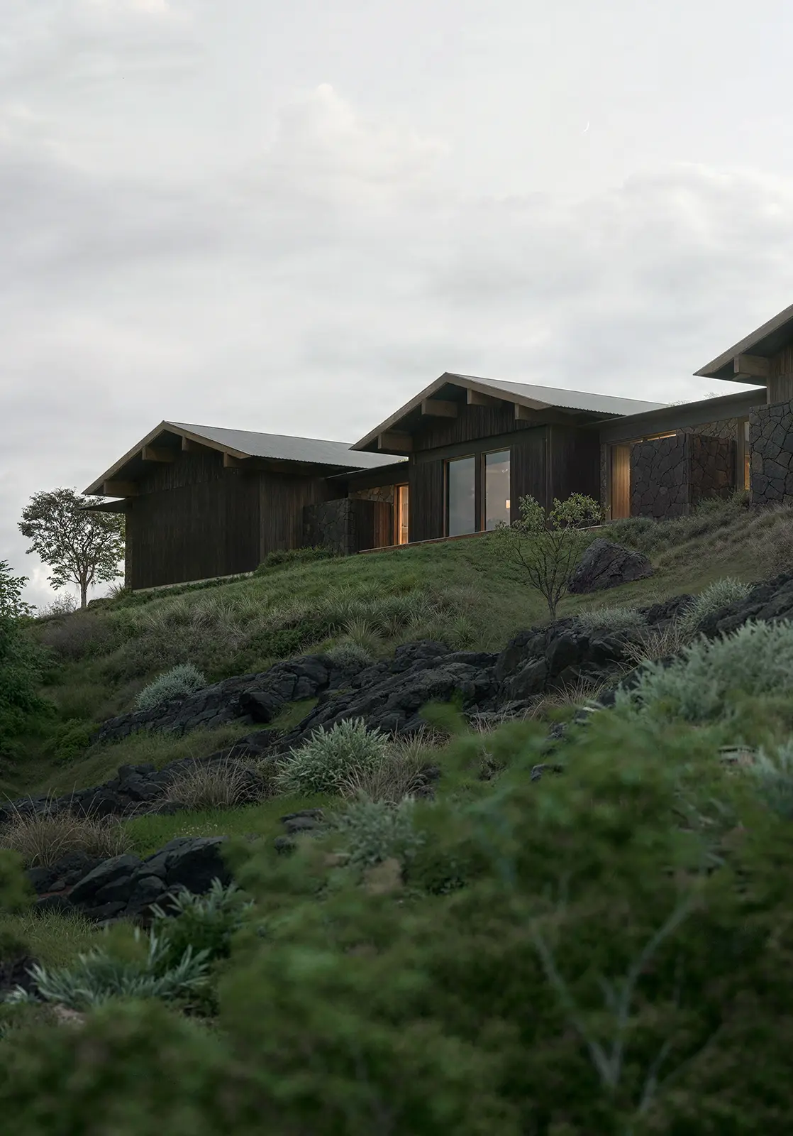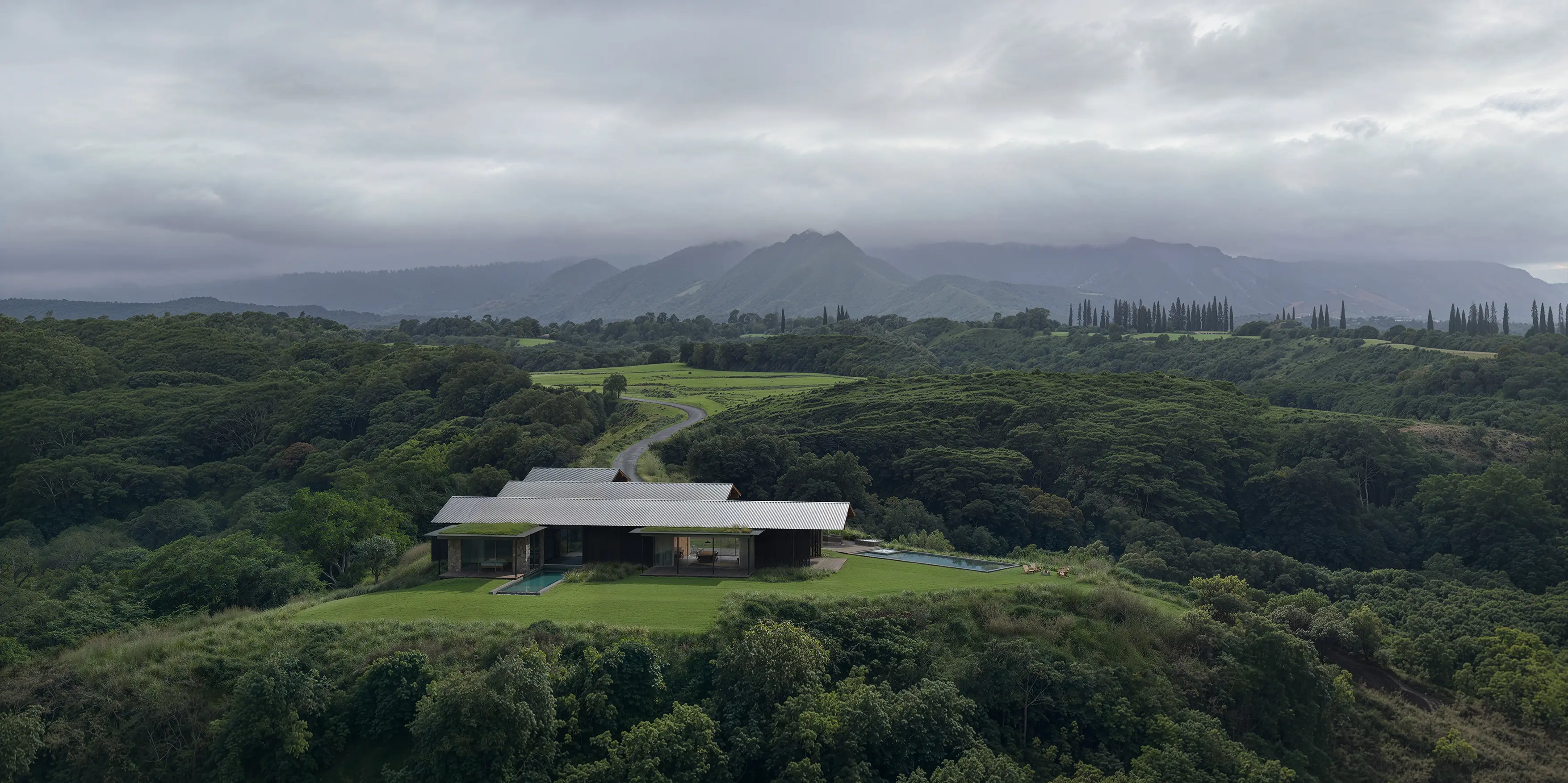 Conceived as a contemporary expression of Kuaʻāina, the architecture draws from Hawaiʻi’s rural and paniolo heritage. The forms reference utilitarian ranch structures—direct, durable, and proportioned with restraint. Copper corrugated roofing will weather in the coastal air, evolving alongside the landscape, while dark, wire-brushed cypress cladding absorbs light and grounds the structure against the openness of sky and field. Deep overhangs and recessed openings respond to climate with the pragmatic logic of working buildings shaped by exposure.