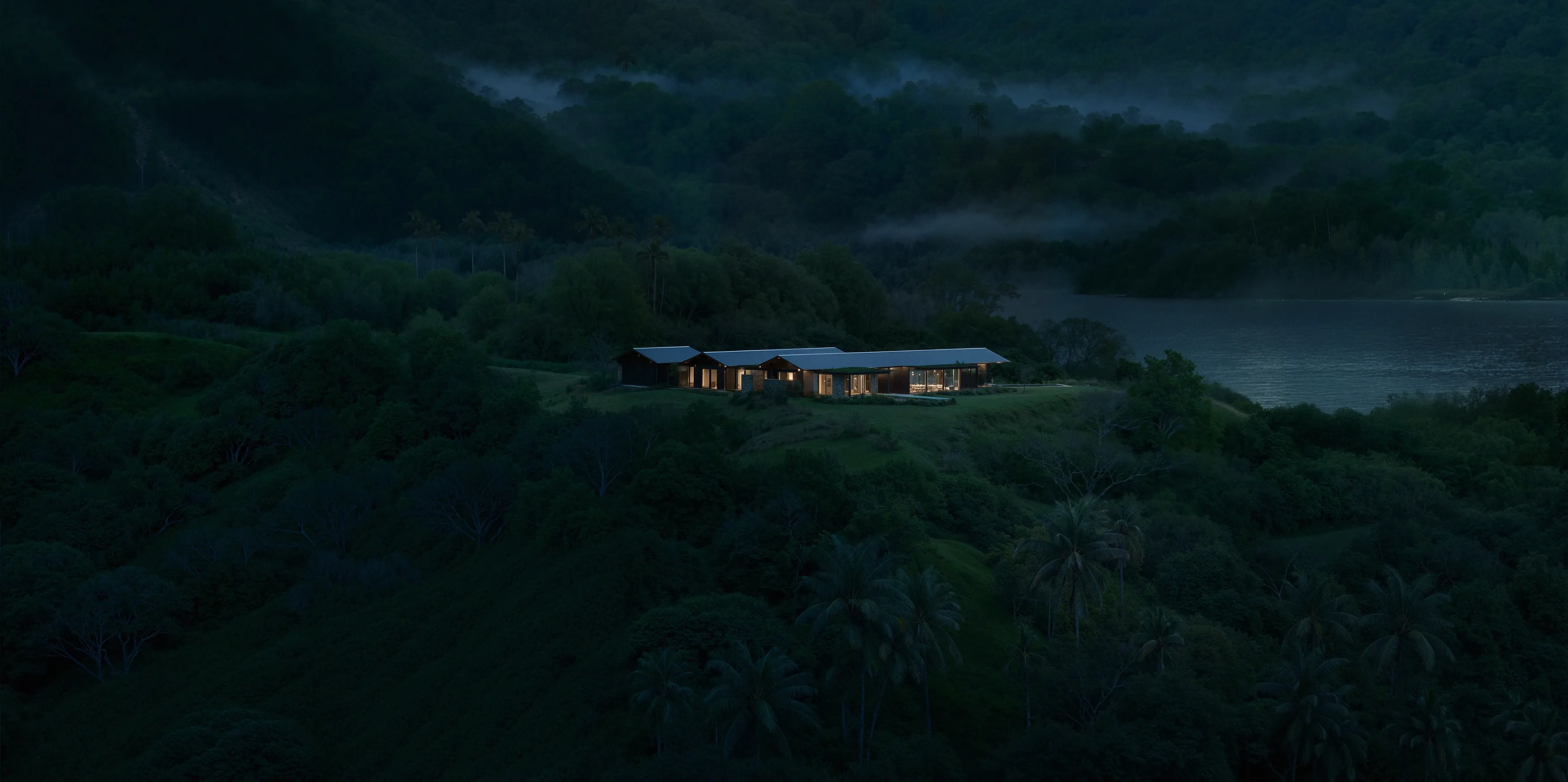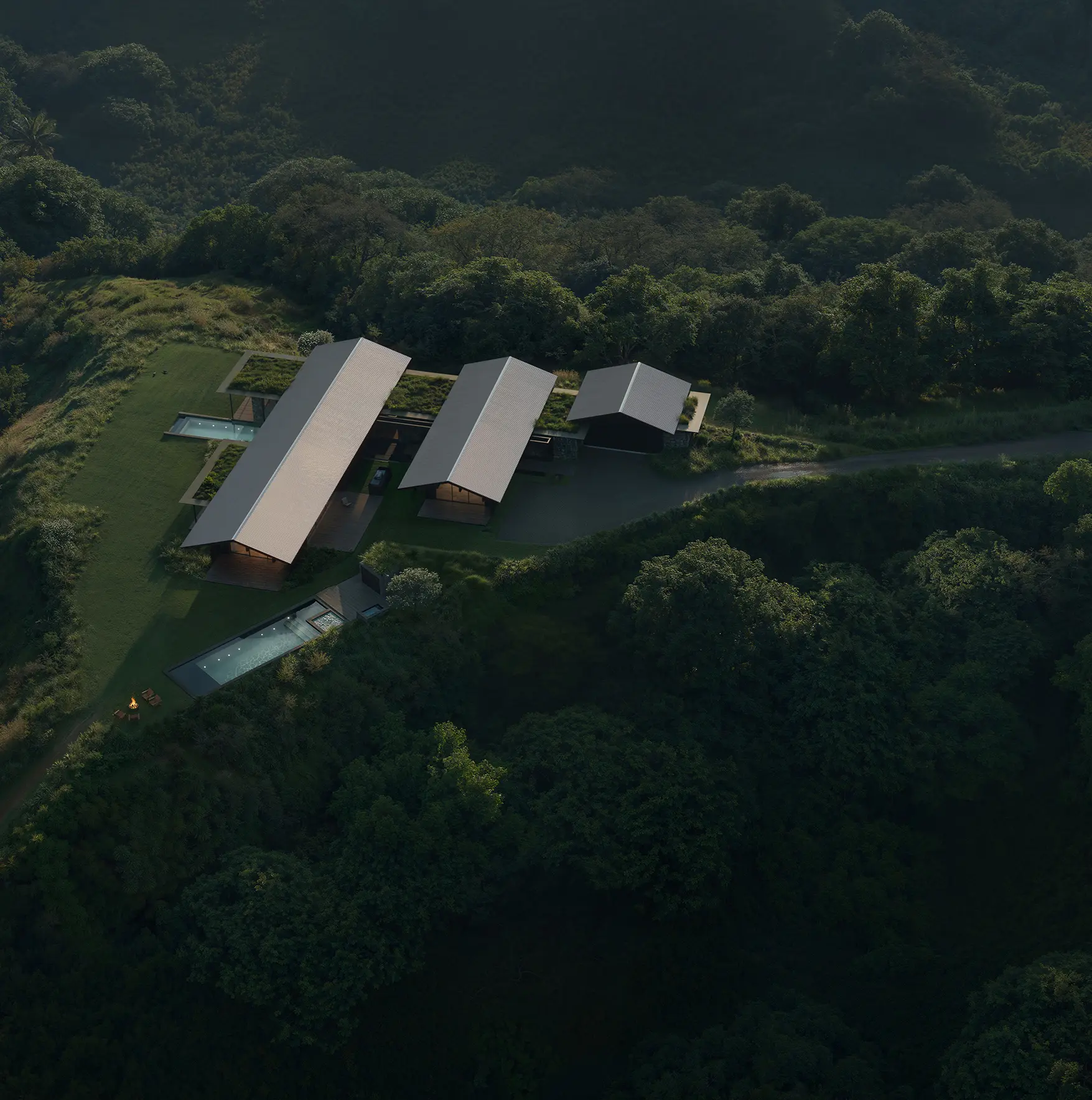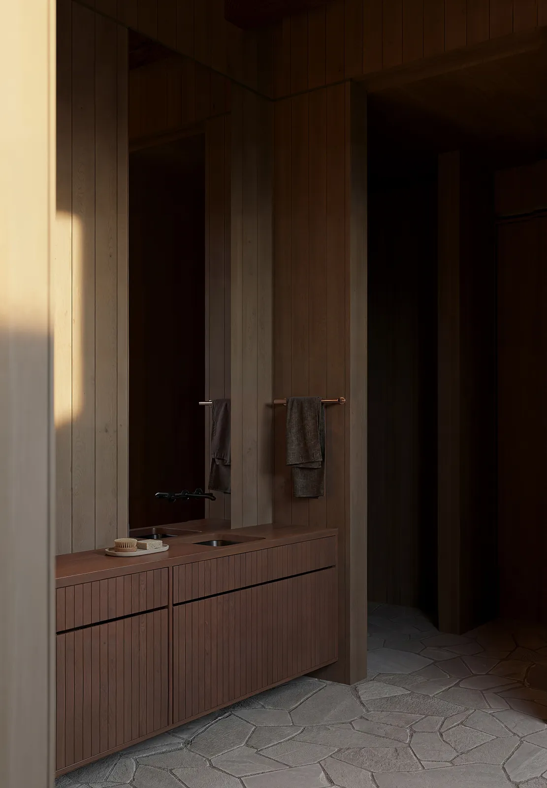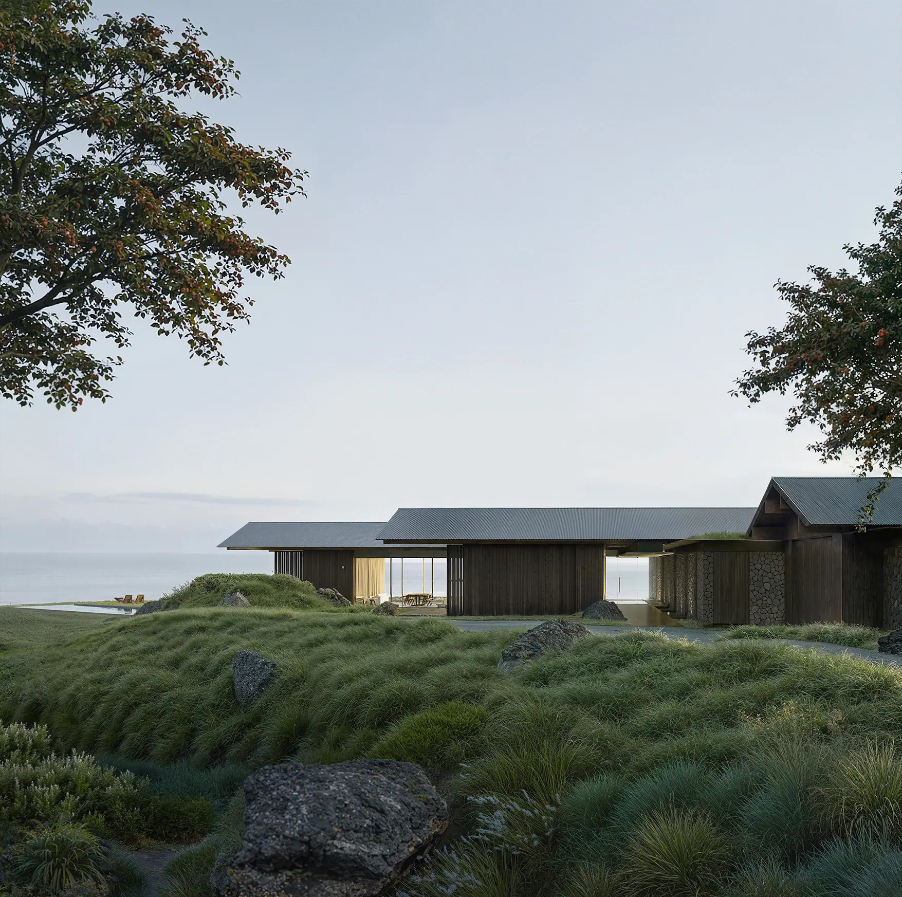 Conceived as a contemporary expression of Kuaʻāina, the architecture draws from Hawaiʻi’s rural and paniolo heritage. The forms reference utilitarian ranch structures—direct, durable, and proportioned with restraint. Copper corrugated roofing will weather in the coastal air, evolving alongside the landscape, while dark, wire-brushed cypress cladding absorbs light and grounds the structure against the openness of sky and field. Deep overhangs and recessed openings respond to climate with the pragmatic logic of working buildings shaped by exposure.