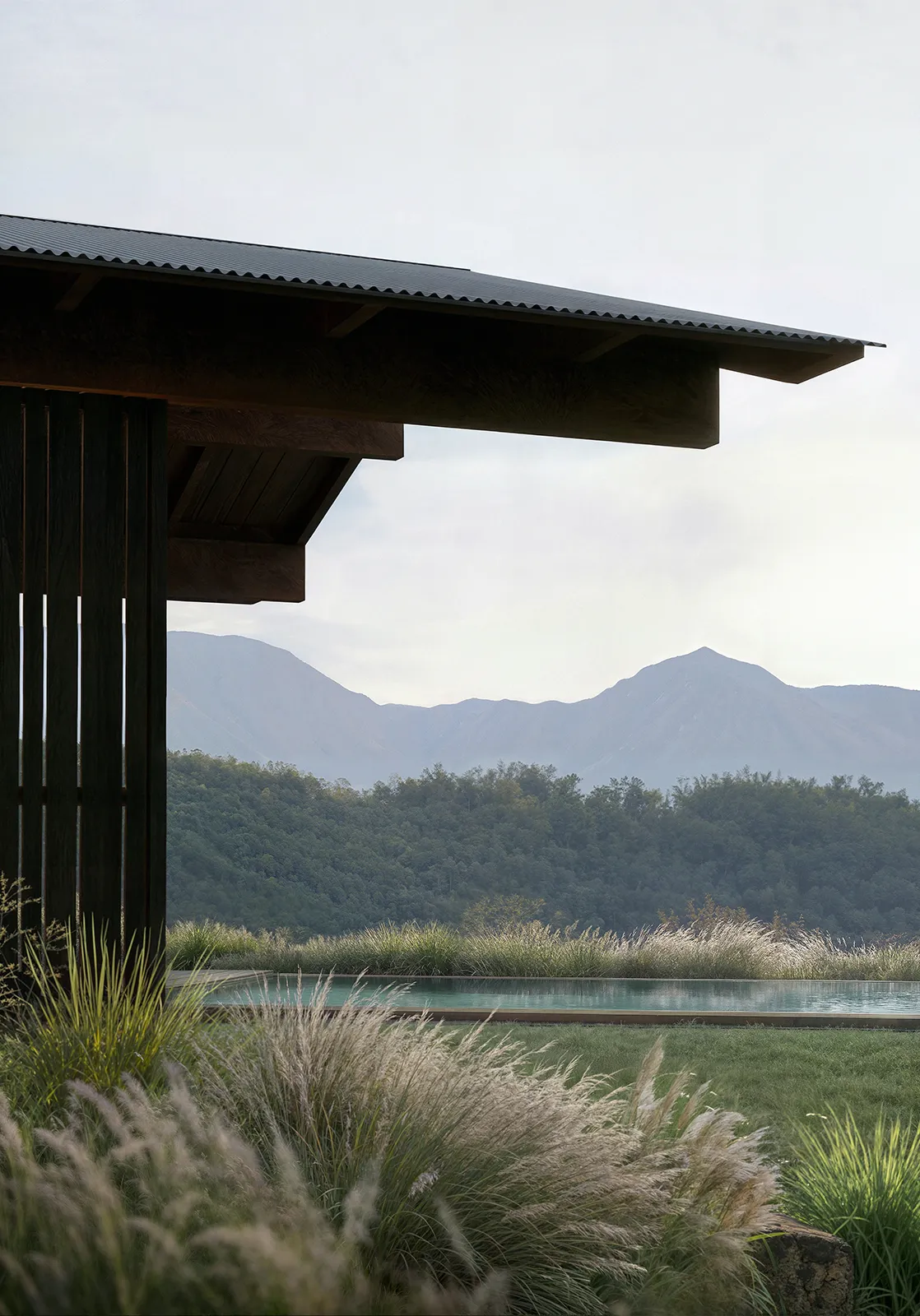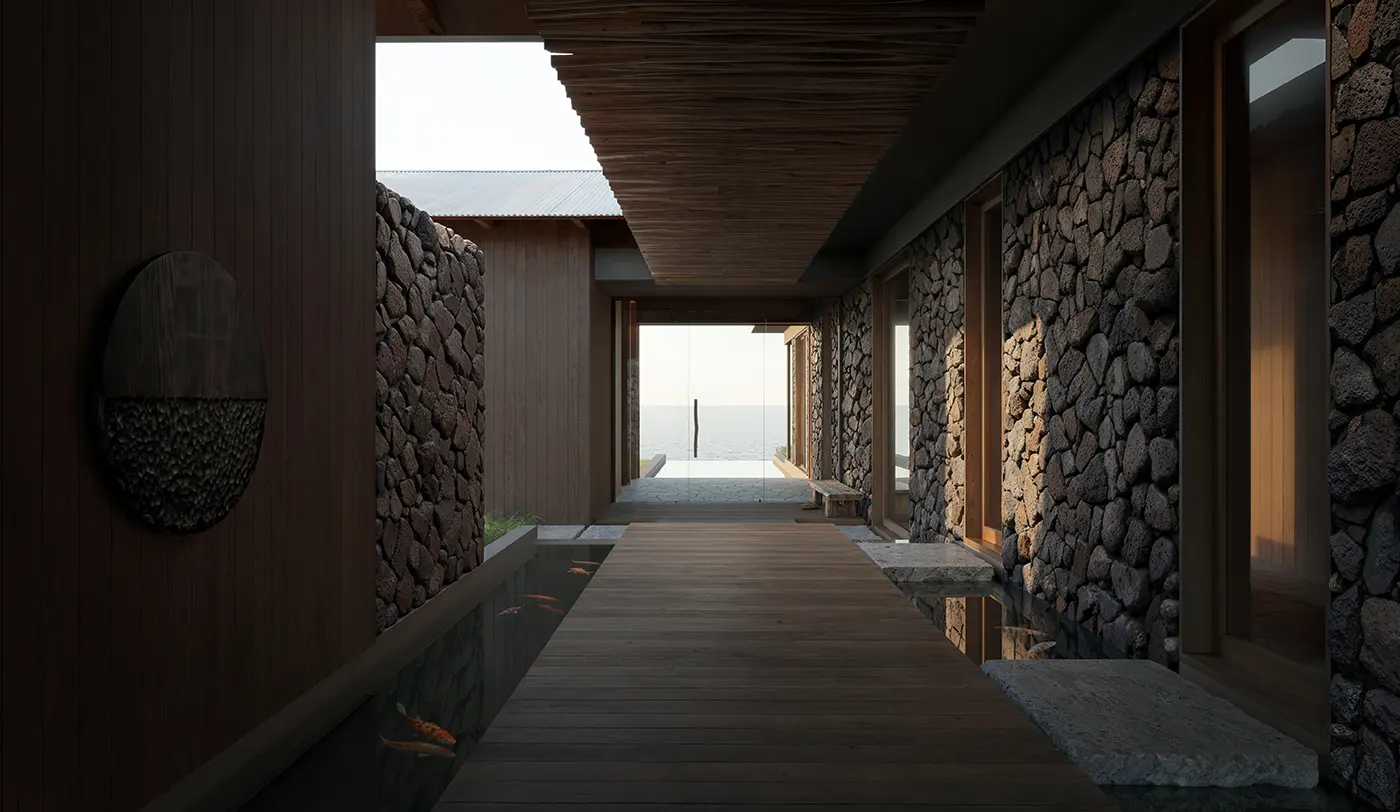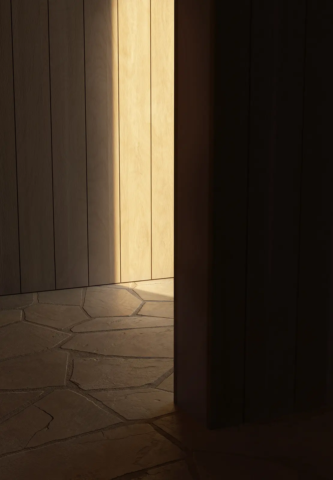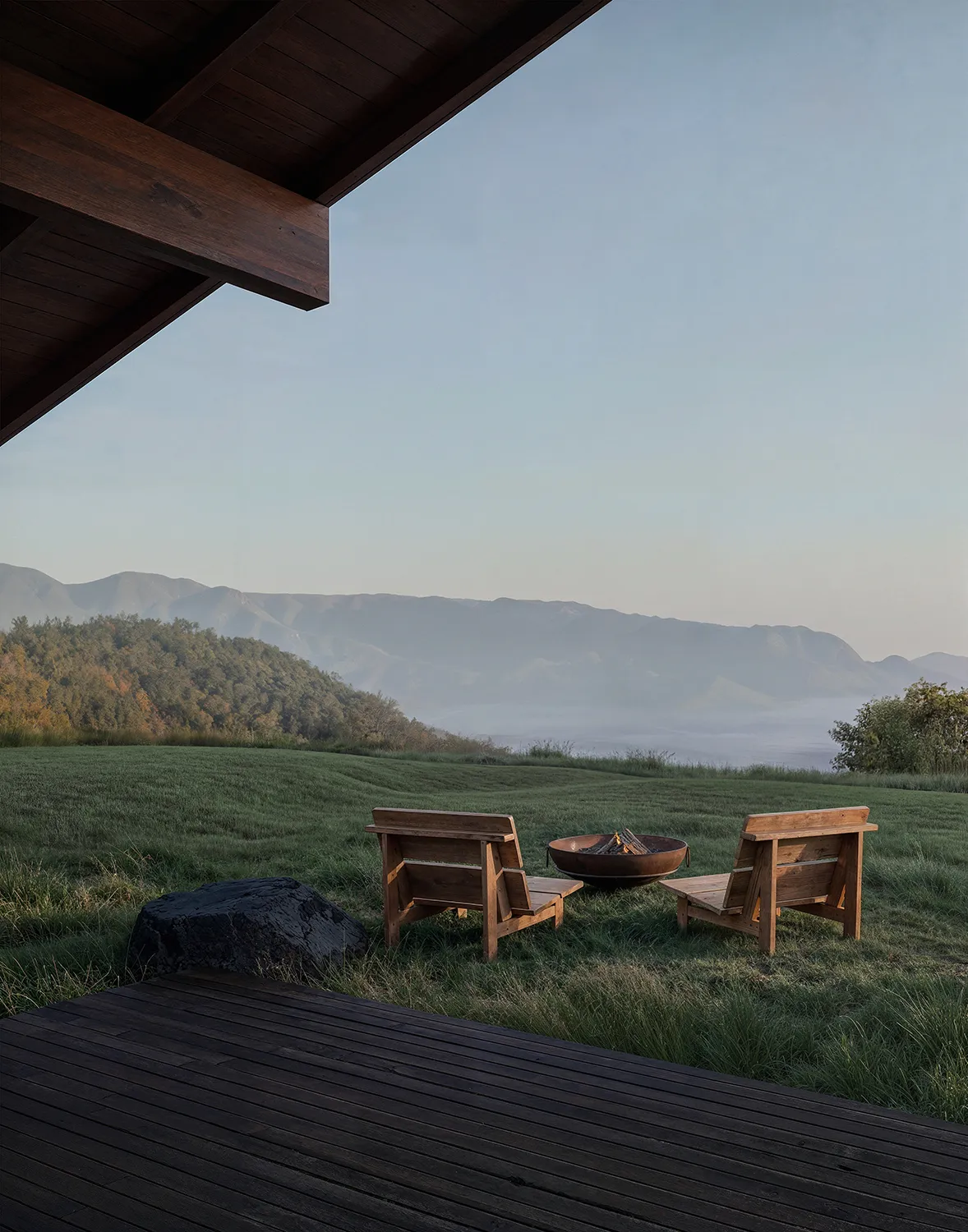 Conceived as a contemporary expression of Kuaʻāina, the architecture draws from Hawaiʻi’s rural and paniolo heritage. The forms reference utilitarian ranch structures—direct, durable, and proportioned with restraint. Copper corrugated roofing will weather in the coastal air, evolving alongside the landscape, while dark, wire-brushed cypress cladding absorbs light and grounds the structure against the openness of sky and field. Deep overhangs and recessed openings respond to climate with the pragmatic logic of working buildings shaped by exposure.