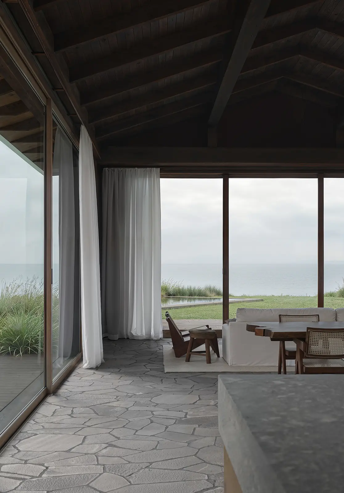 Lava rock walls emerge from the site, binding the home physically and culturally to the land. Expressed steel framing and tall panes of glass orient primary spaces toward uninterrupted ocean views, balancing solidity and openness. Outdoor rooms remain sheltered from trade winds while maintaining a clear awareness of the bluff’s edge.