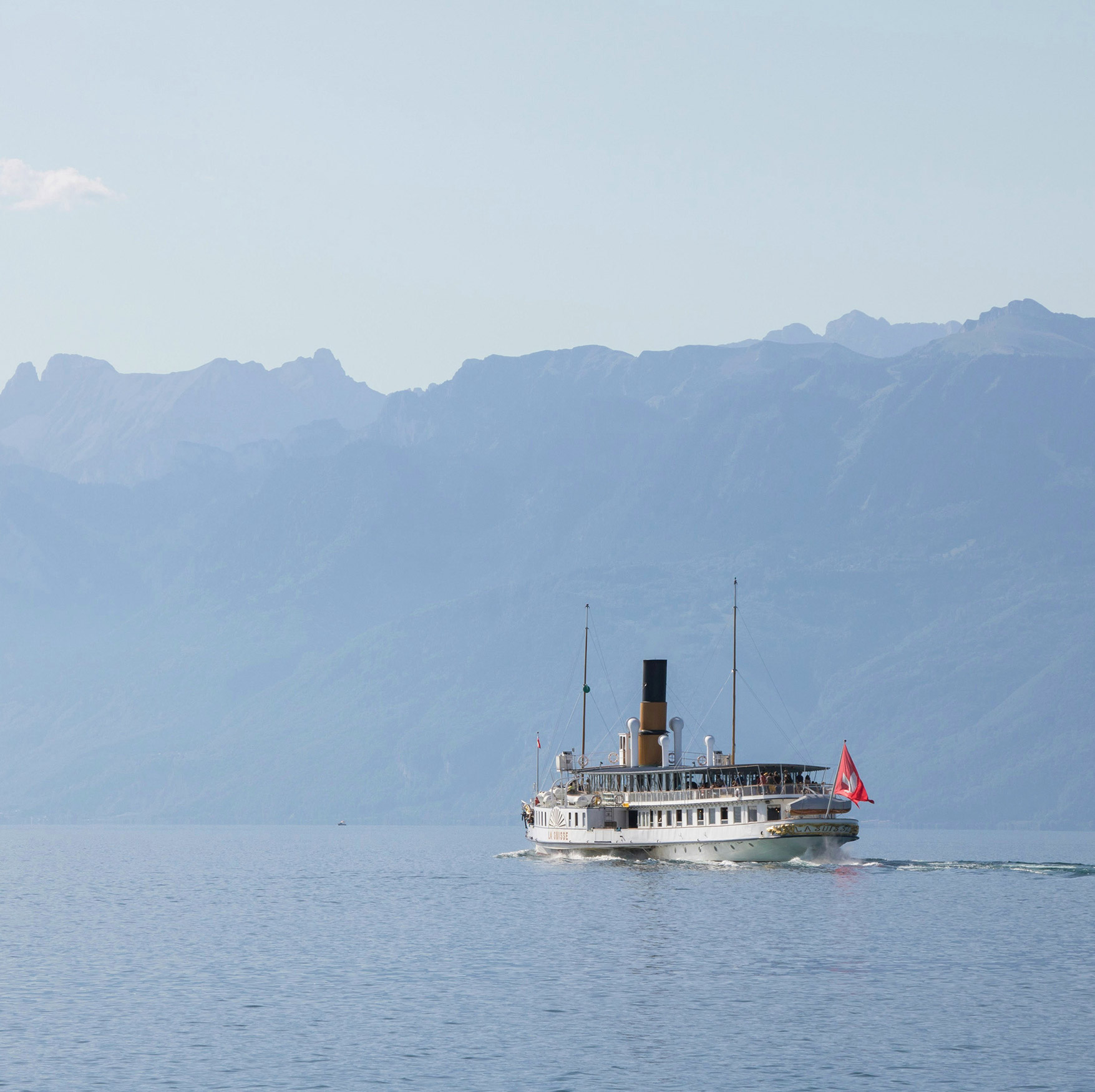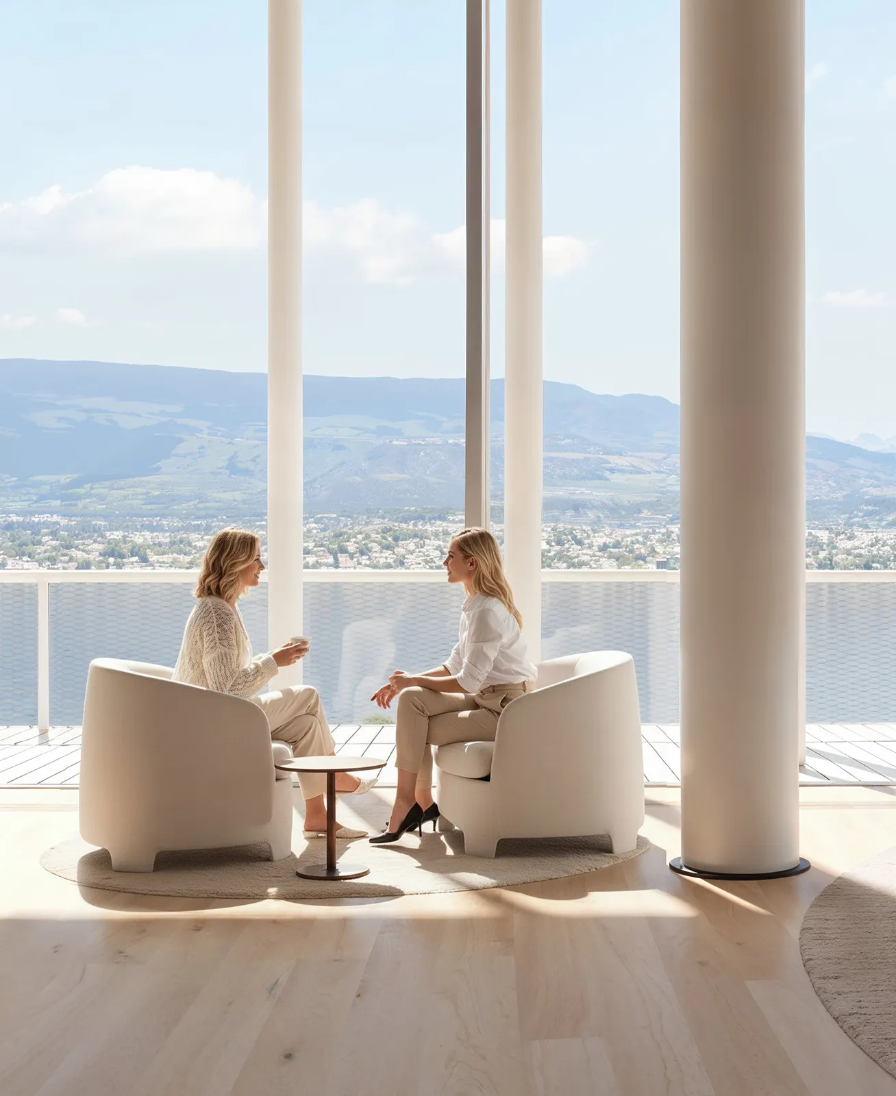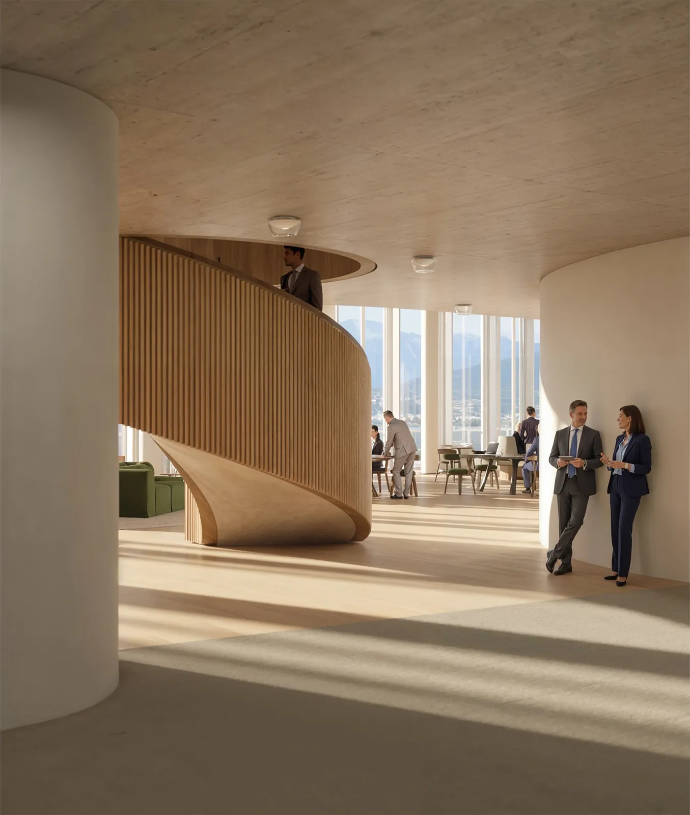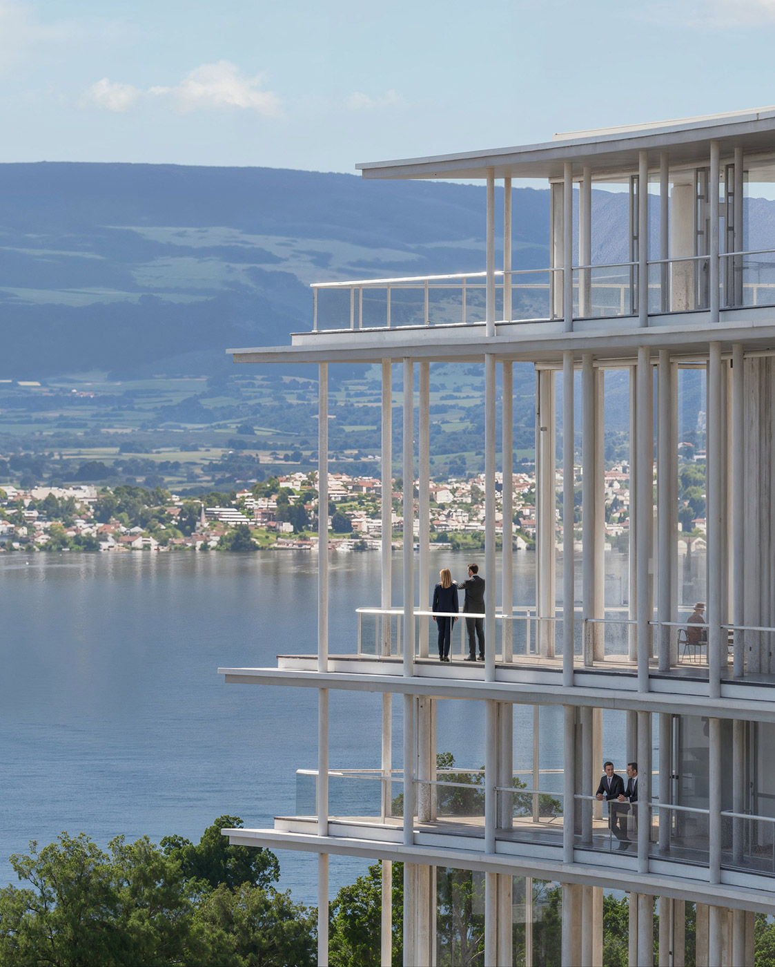 The façades are treated identically, with no distinct front or back. The transparent, open building, with its fully glazed façades, maximizes the perception of le Grand Paysage – the lake, the mountains, and the green surroundings. Through a canyon-like central atrium lined with meeting rooms, natural light reaches even the deepest parts of the building.