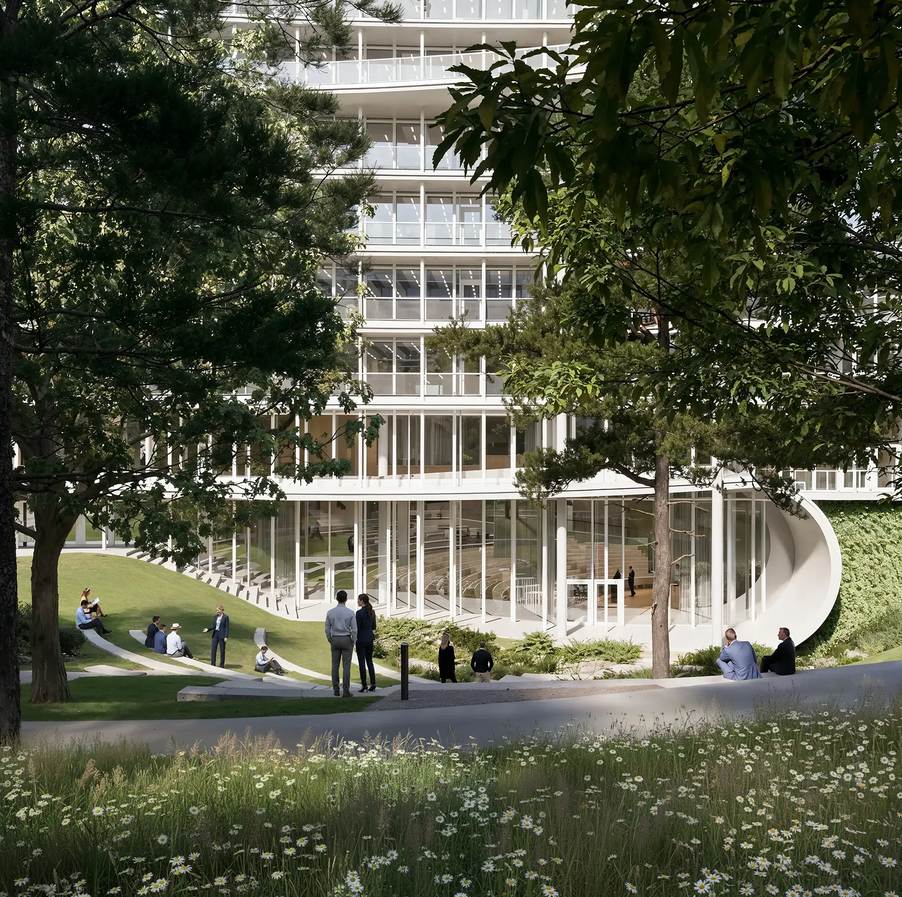 The building is characterized by thin, curved slabs that cantilever out, providing passive sun shading for the glazed façades and offering accessible, covered outdoor spaces for staff and clients. The curves are not always superimposed, the contours vary, and the terraces differ in orientation and size according to adjacent programs—the building breathes. Slender, white columns support the terraces and blend with other vertical elements such as rainwater pipes and guides for the textile sun shading. The cantilevering slabs reduce reflections on the glazing, and together with stepped slab edges enhance the airiness of the building.