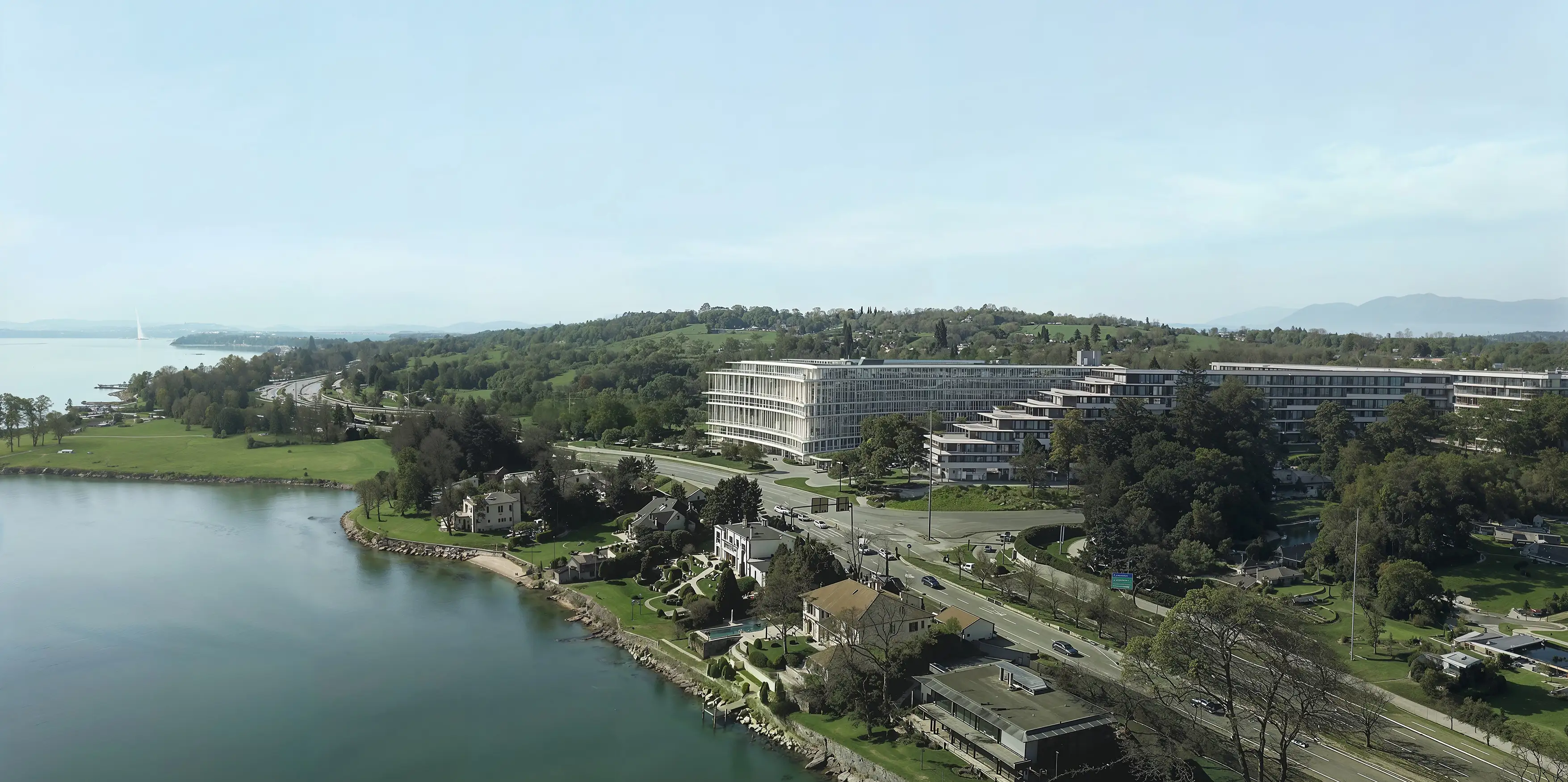One Roof is situated in Bellevue, north of Geneva’s city center, as part of the 2017 Champ-du-Château masterplan which includes a large housing complex, a park, and underground car and bike parking. The surrounding area is characterized by its residential nature and abundant green spaces, with proximity to both the botanical gardens and the Quartier des Nations, home to several international organizations. The site offers excellent connectivity through public transportation and links to an extensive bicycle network.