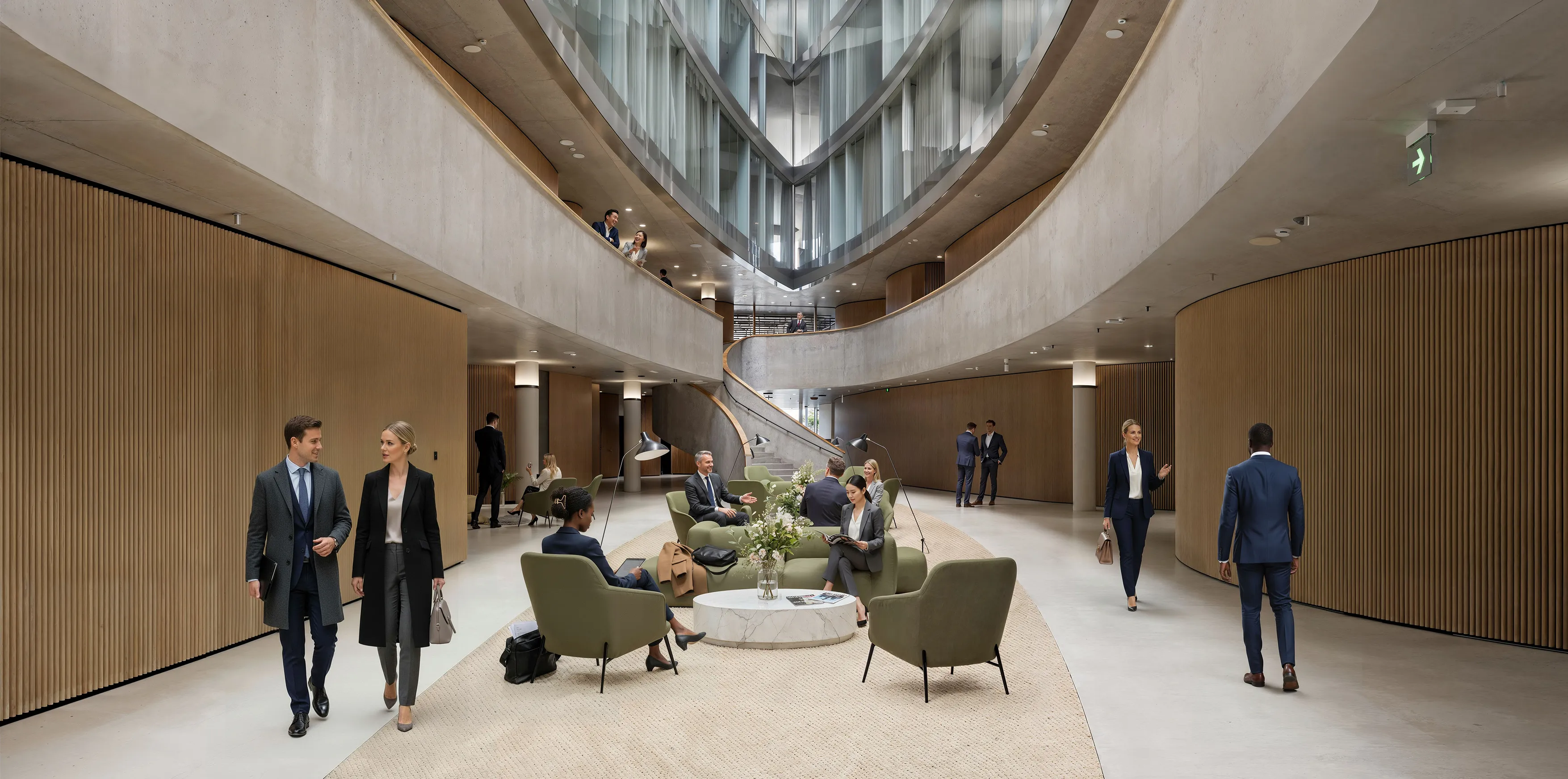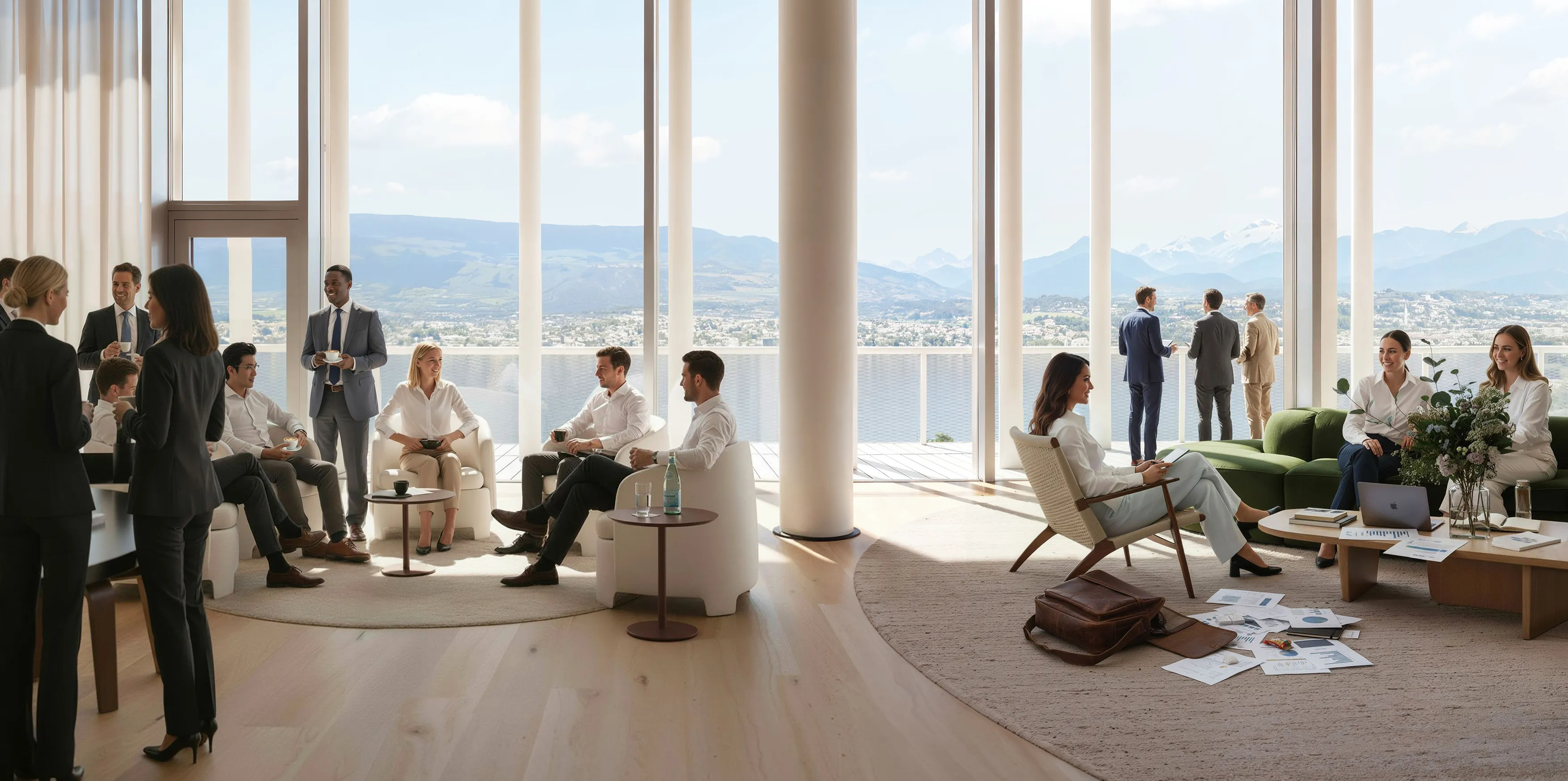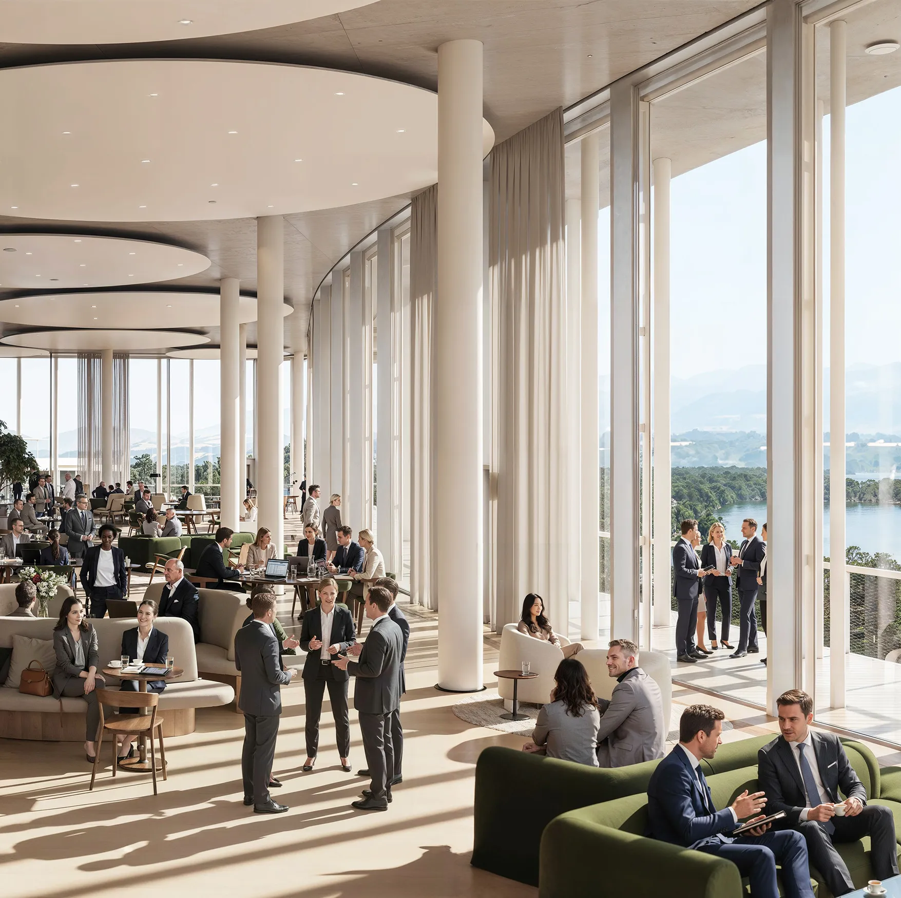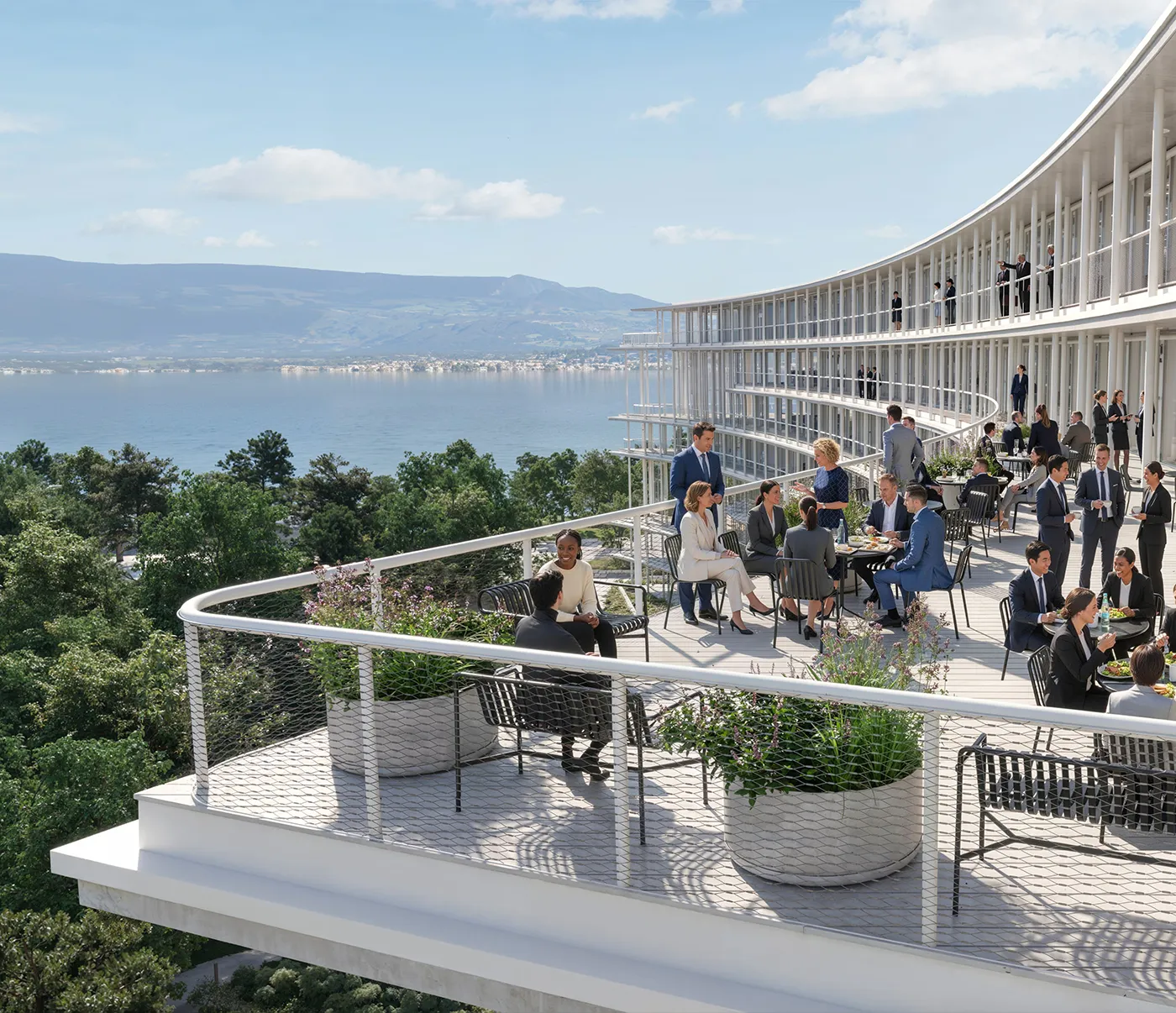 Located on the shore of Lake Geneva, the new Lombard Odier ‘One Roof’ headquarters brings together 2,000 employees previously dispersed across six sites in Geneva, while offering capacity for up to 2,600. The new building embraces transparency and flexibility through a design guided by two main principles: maximizing the perception of the natural surroundings and creating interior spaces that foster collaboration.